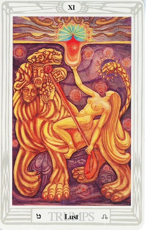 「欲望(Lust)」の語源はlusterまたはLightで、宗教的な「喜び」を表す言葉です。元来は力(Strength)も、光(Light)も、欲望(Lust)も、神聖(Holiness)も、すべて同じ語源を持っているのです。クロウリーの「欲望」カードには豊満な女性の性的な描写があります。現代においては中傷の的となっている、バビロンの娼婦としての女性像(バビロン)です。